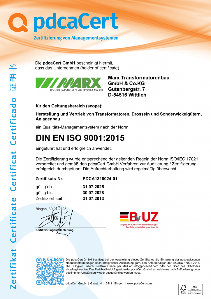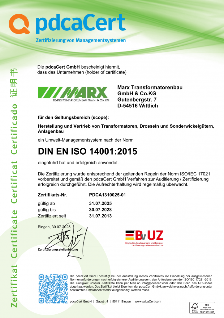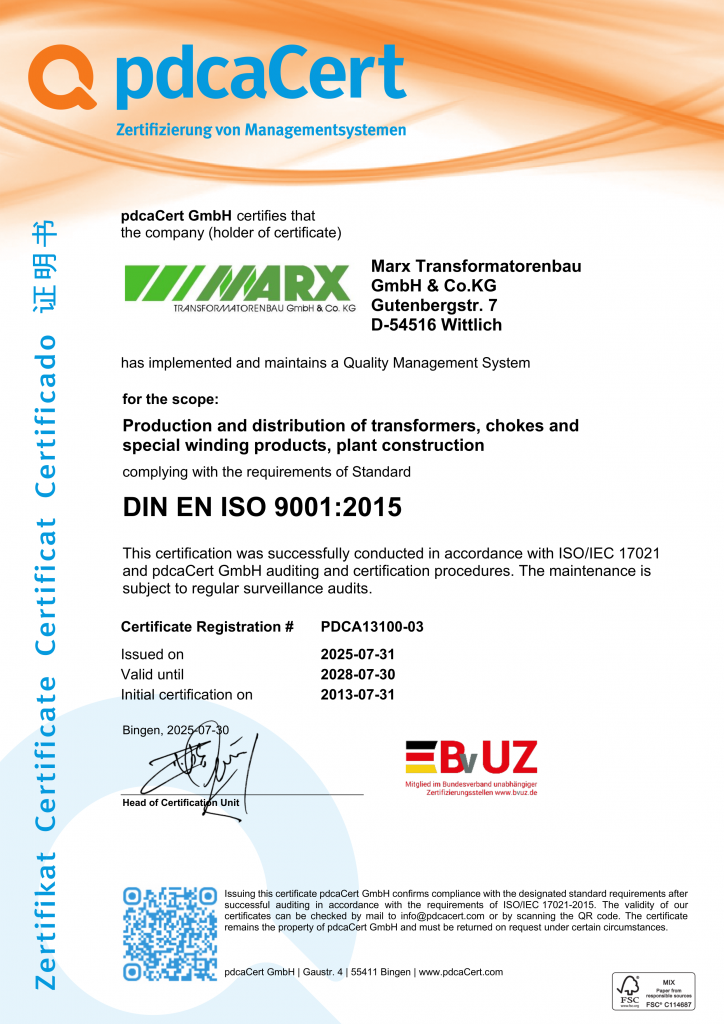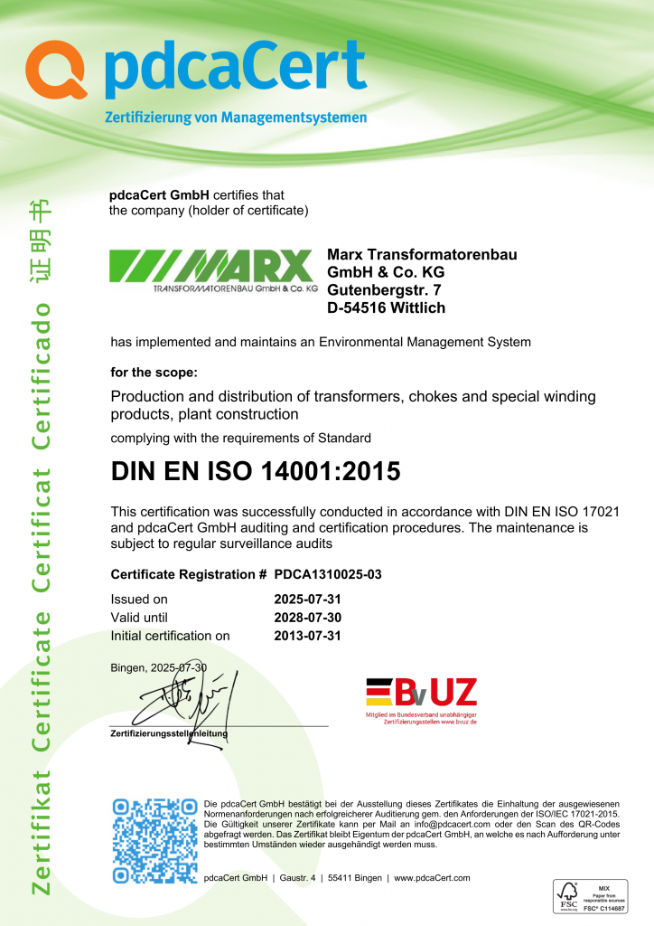 Die Marx Transformatorenbau GmbH & Co. KG ist nach DIN EN ISO 9001 und DIN EN ISO 14001 zertifiziert.